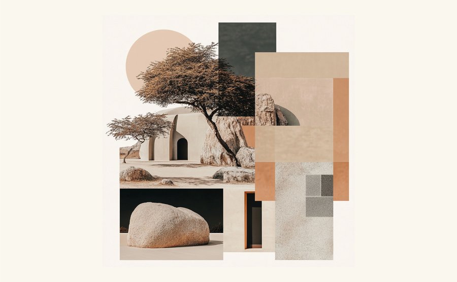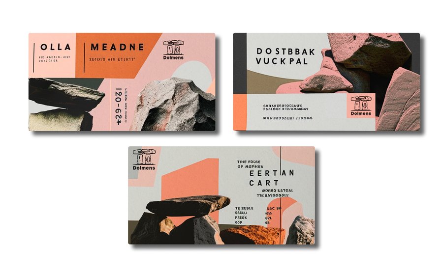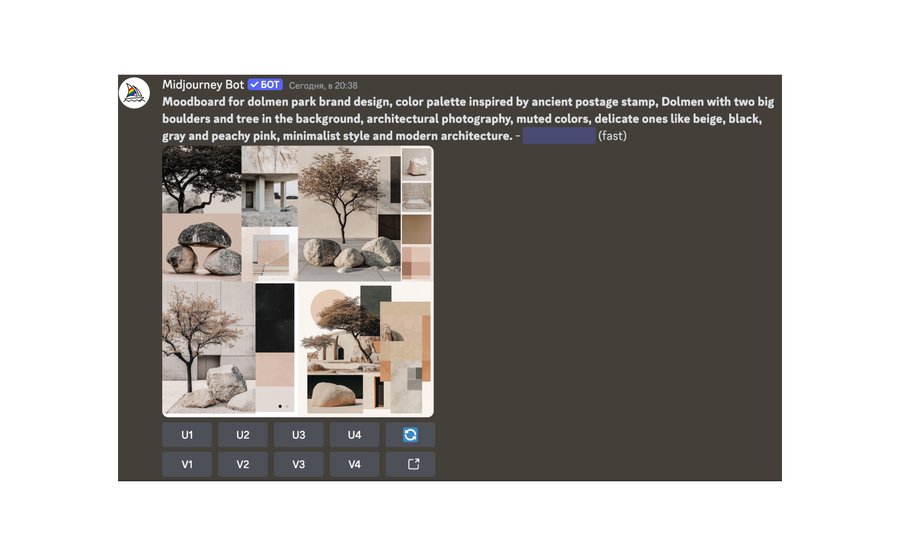 Используемый промт: Moodboard for dolmen park brand design, color palette inspired by ancient postage stamp, Dolmen with two big boulders and tree in the background, architectural photography, muted colors, delicate ones like beige, black, gray and peachy pink, minimalist style and modern architecture.