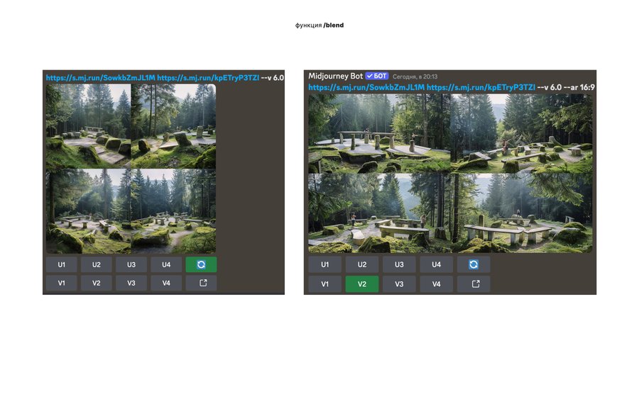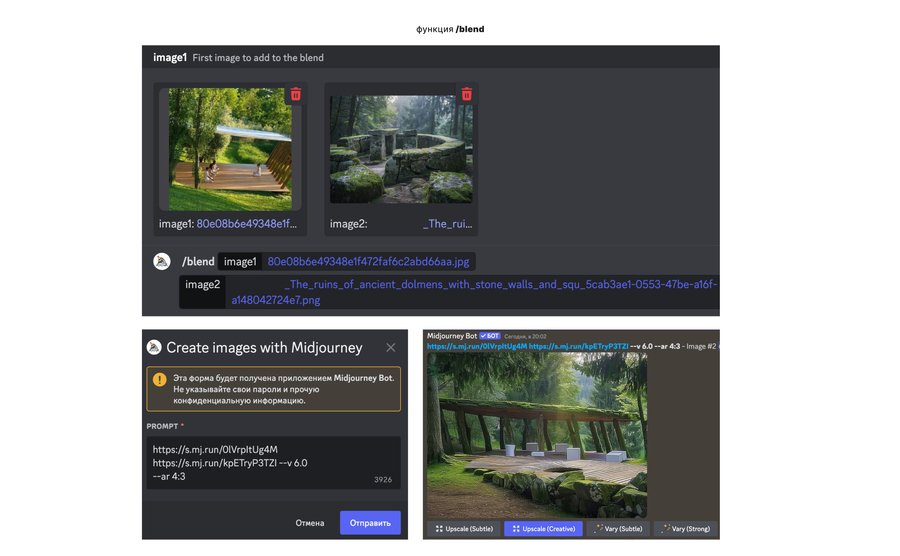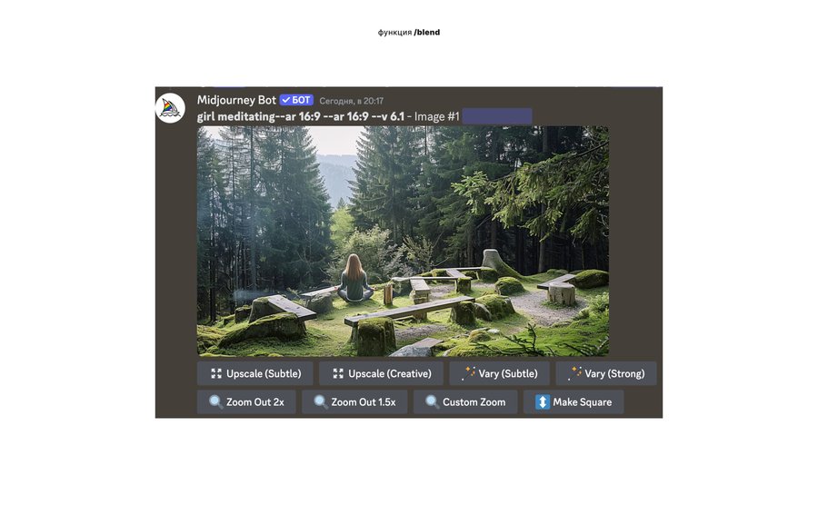 Чтобы воплотить пространство для медитаций, была использована функция /blend , которая позволяет соединить основные стилистические приемы двух разных изображений.