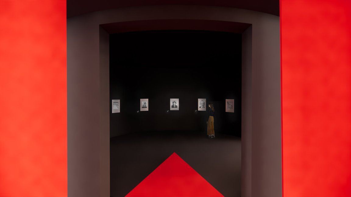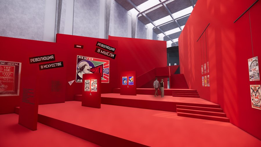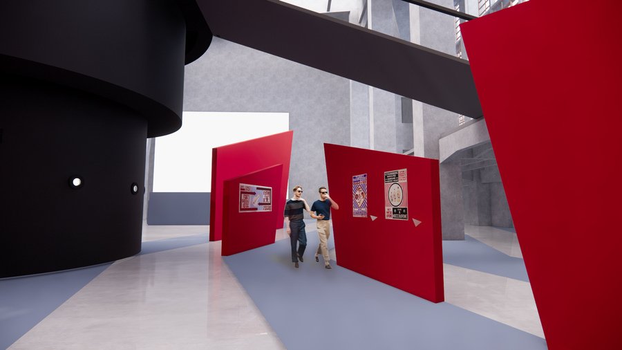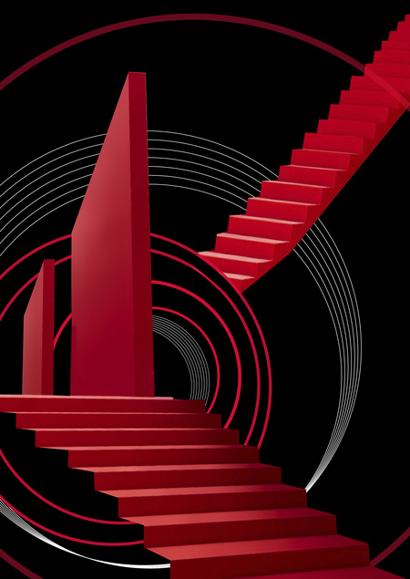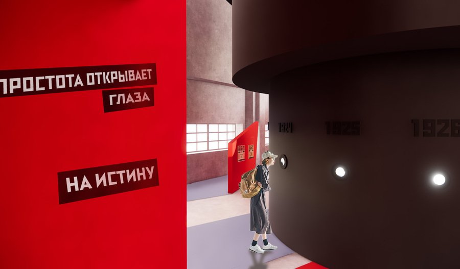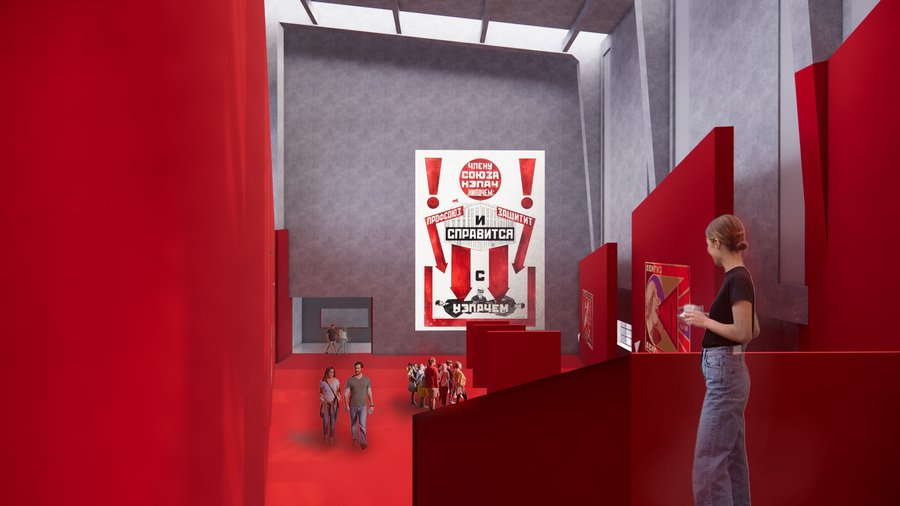 Основной объединяющей структурой выставки является красная лестница, ведущая наверх в форме треугольника. Она, аналогично плакатам, привлекает внимание общественности и направляет его на нужный автору ракурс.