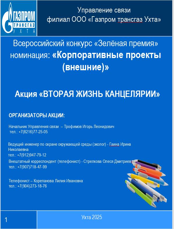 Описание проекта: В городе Ухта Республики Коми, где отсутствует специализированный сбор и переработка канцелярских принадлежностей, филиалом Управления Связи ООО «Газпром трансгаз Ухта» был организован первый сбор отработанных ручек, фломастеров и маркеров. К инициативе присоединились школы, другие учебные заведения и сотрудники нашей организации. Найденное попутное транспортное средство обеспечило безвозмездную доставку собранного сырья в экоцентр «Собиратор» в Санкт-Петербурге. Благодаря этой акции Ухтинский полигон получил на 29 кг меньше отходов для захоронения.