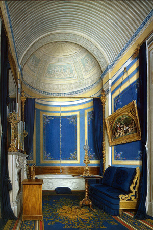 В этих помещениях архитекторы использовали элементы, отсылающие к античным баням и домам, включая ванны из цельных кусков мрамора и специфические росписи, что отражало моду на более интимное и исторически достоверное восприятие античности.
