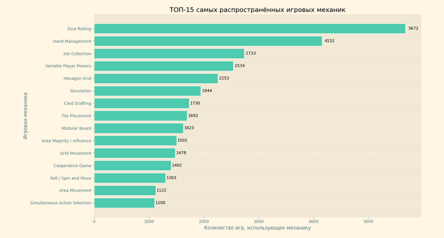 Из графика видно, что фундамент современной настольной игры составляют проверенные временем, базовые механики. В лидерах по распространённости оказались «Управление рукой» (Hand Management), «Бросок кубиков» (Dice Rolling) и «Размещение рабочих» (Worker Placement).
