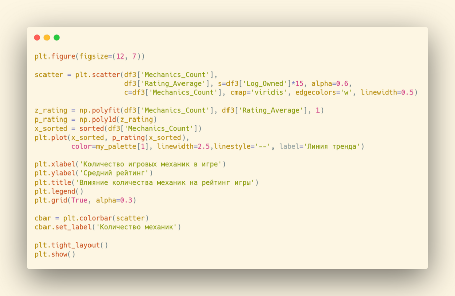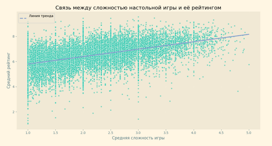 Казалось бы, глубокая игра должна нравиться больше. Чтобы это проверить, я построила точечную диаграмму, где каждая точка — это одна игра. По горизонтали — её сложность, по вертикали — средний рейтинг. Линия тренда, проходящая через эти точки, показала общую тенденцию.
