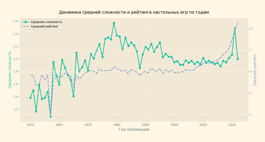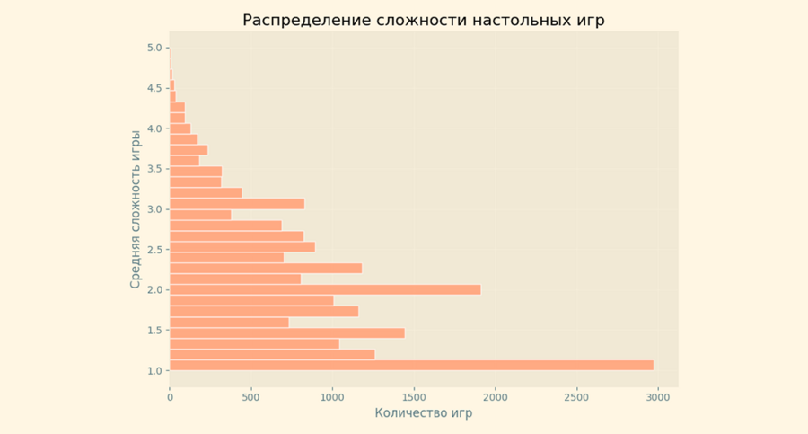 Картина чёткая: подавляющее большинство издаваемых игр — низкой и средней сложности. Пик приходится на значение около 2.0 по шкале BoardGameGeek. Это логичная стратегия рынка: издатели делают ставку на игры, которые будет легко понять и начать играть, чтобы привлечь как можно больше людей.