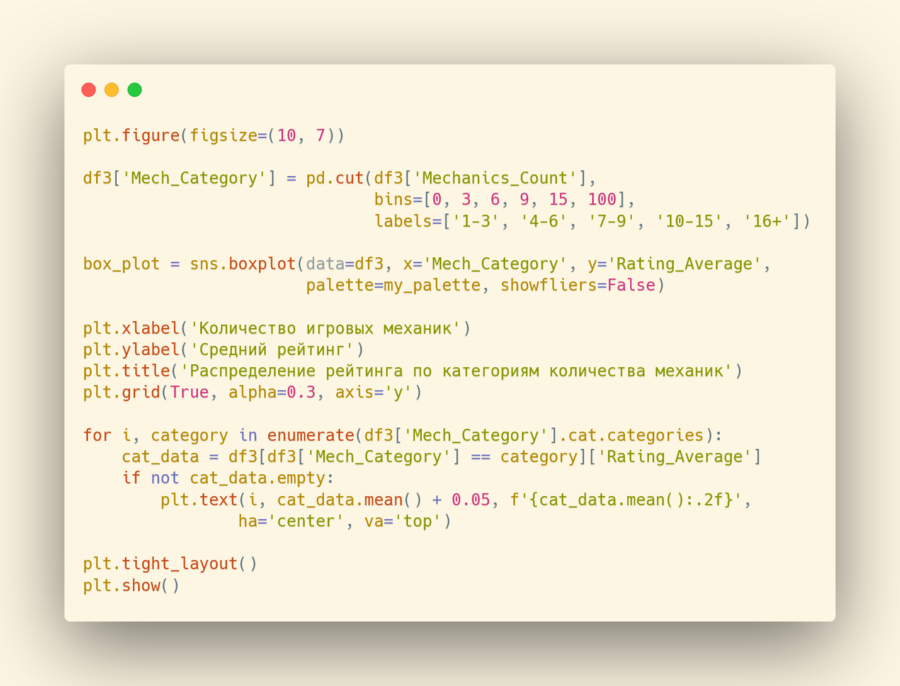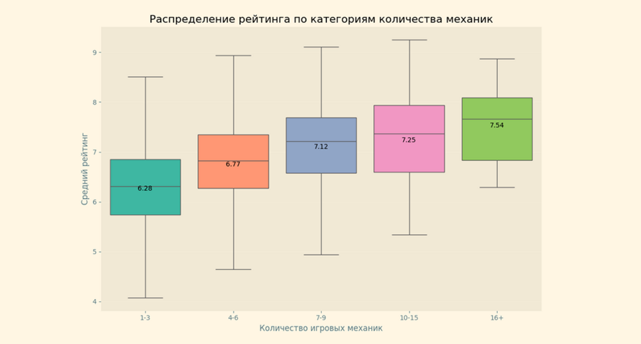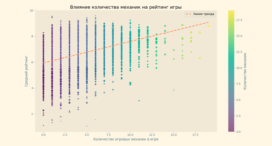 Игры с умеренным количеством механик (примерно 7-9) демонстрируют самый стабильный и высокий результат.