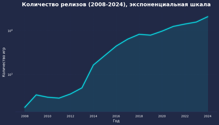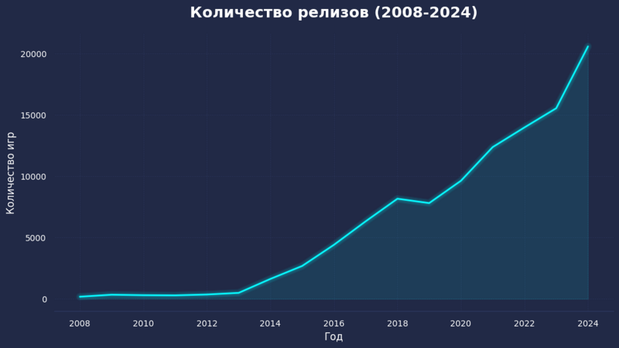 График иллюстрирует ежегодное количество релизов в Steam в период с 2008 по 2024 год. До 2012 года количество новых игр оставалось минимальным из-за жесткого отбора и закрытости платформы. Однако ситуация кардинально изменилась после того, как компания Valve запустила программы Steam Greenlight, а затем Steam Direct. Эти инициативы упростили доступ к магазину для независимых разработчиков, что привело к экспоненциальному росту числа релизов: если в начале пути счет шел на сотни, то к 2024 году этот показатель превысил отметку в 20 000 игр в год.