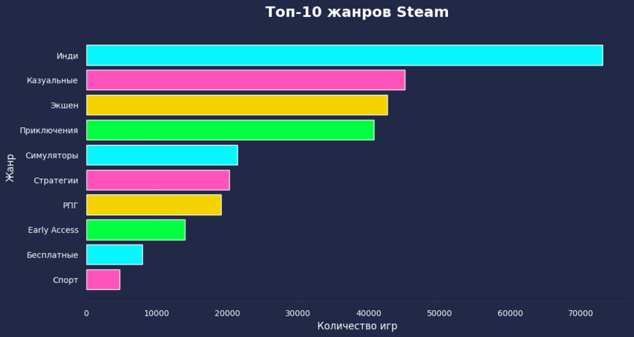 В жанровой структуре лидирует инди-сегмент, что подтверждает прямую связь между доступностью платформы и «взрывным» ростом числа релизов за счет независимых студий. Вторую и третью позиции занимают казуальные игры и экшены — их лидерство обусловлено универсальностью механик и ориентацией на массового потребителя. В то же время стратегии и RPG представляют меньшую долю рынка, что объясняется их высокой ресурсоемкостью, сложностью разработки и более узким кругом целевой аудитории.