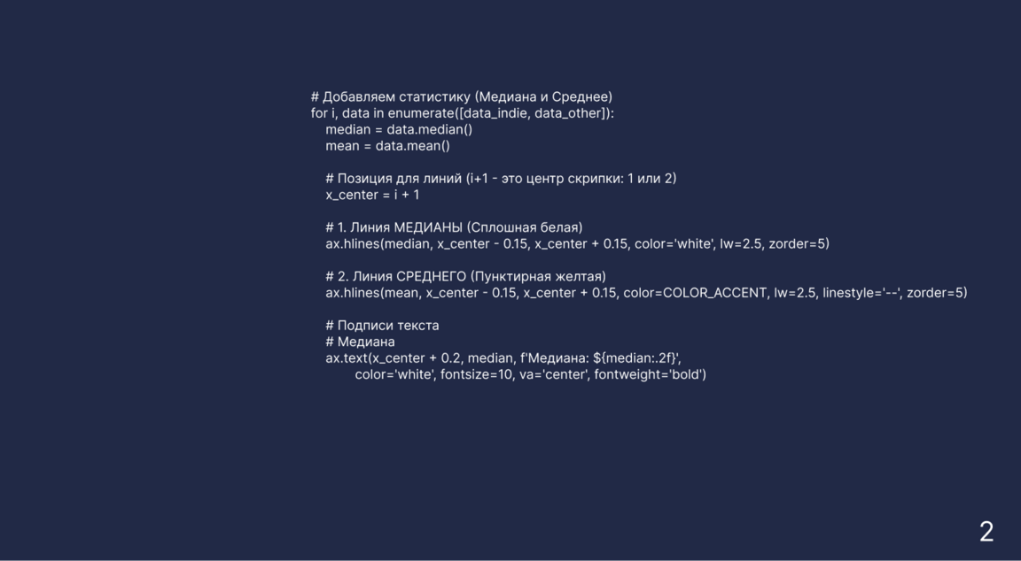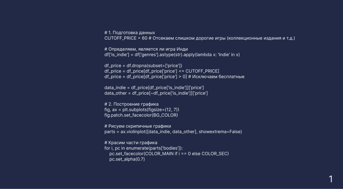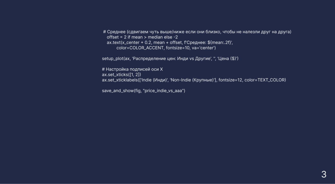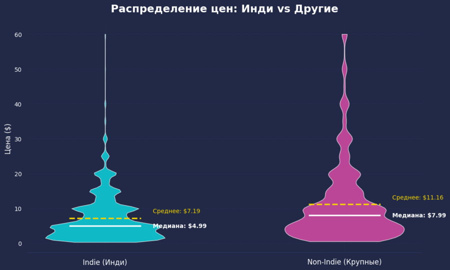 График наглядно показывает расслоение рынка на два ценовых лагеря. Инди-игры в основном стоят от 5 до 15 долларов — на «скрипке» это видно по самому широкому розовому участку внизу. В этой зоне огромная конкуренция, и разработчики стараются держать цены низкими. У крупных студий ситуация иная: их график вытянут вверх, и заметны четкие пики на отметках 40 и 60 долларов. Это классические ценники для больших хитов, и видно, что такие компании могут позволить себе ставить высокую планку. Если сравнить средние цены (белые линии), то у инди-разработчиков они почти в два раза ниже. Это логично, ведь затраты несопоставимы: большие компании тратят миллионы на офисы, огромный штат и рекламу, тогда как одиночки или маленькие команды часто делают игры в свободное время как хобби. Также интересно, что на графике видны «всплески» именно на круглых суммах вроде 5, 10 или 20 долларов — издатели явно предпочитают такие психологически понятные ценники.