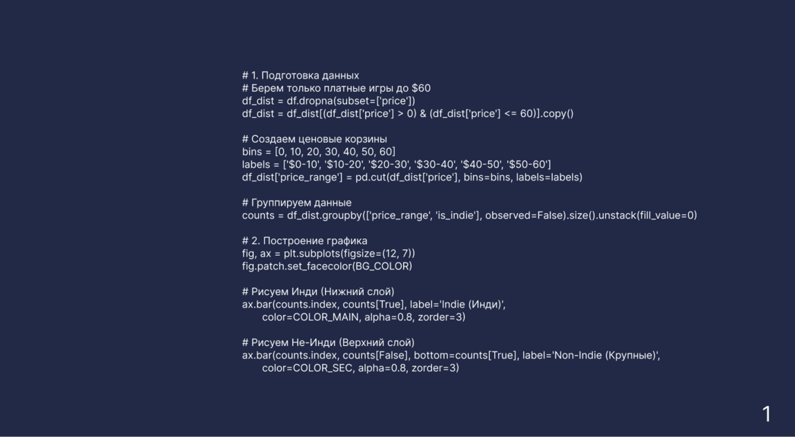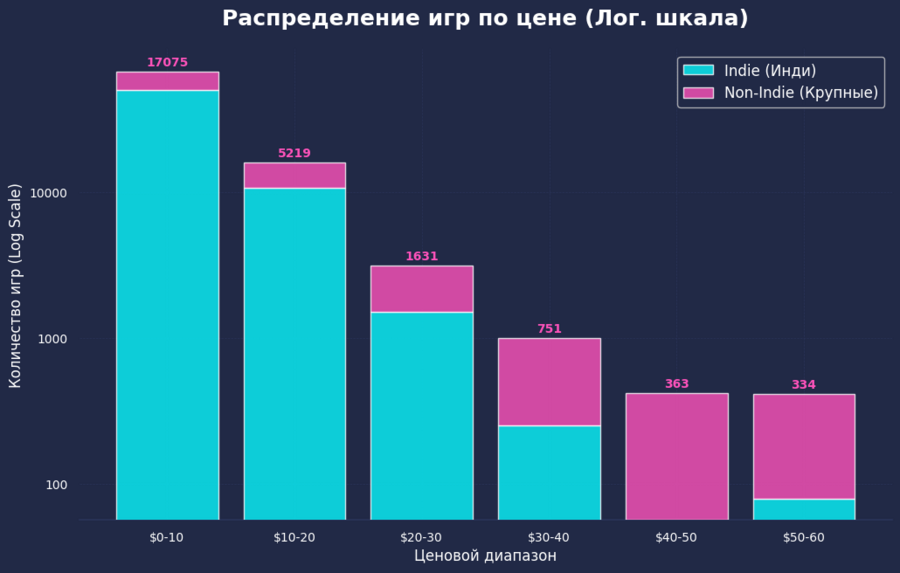 Этот график наглядно подчеркивает огромную диспропорцию на рынке. В категории до 10 долларов мы видим настоящий «океан» игр: голубой цвет на первом столбце просто перекрывает всё остальное, так как независимые разработчики массово выпускают бюджетные проекты. На этом фоне крупные игры (розовые сегменты) выглядят буквально как капля в море, особенно в дешевом сегменте. В итоге получается интересная ситуация: для игрока с небольшим бюджетом выбор кажется бесконечным, а вот количество по-настоящему крупных блокбастеров на рынке на самом деле очень ограничено.