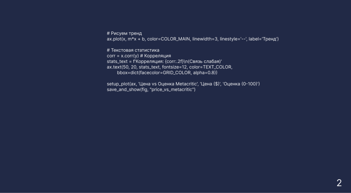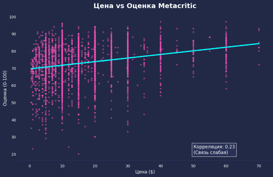 Этот график разрушает популярный миф о том, что дорогая игра — значит хорошая. Линия тренда здесь почти горизонтальная, а это говорит о том, что цена проекта практически не влияет на его итоговый рейтинг. На графике полно примеров, когда копеечные инди-игры получают оценки 90+, становясь настоящими шедеврами, и наоборот — дорогущие блокбастеры за $60 с треском проваливаются. При этом у дешевых игр разброс оценок гораздо сильнее: среди них много как скрытых алмазов, так и откровенно слабых проектов, которые и выпускают по низкой цене. Также хорошо заметно, как цены группируются вокруг «круглых» сумм — $5, $10, $20. Это чистый маркетинг, ведь игрокам психологически проще воспринимать такие ценники.