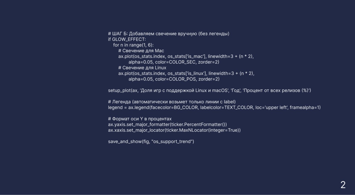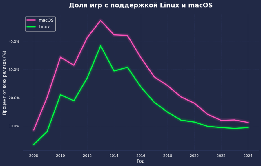 Этот график полностью подтверждает мою теорию: количество игр для Linux и macOS вовсе не падает. Наоборот, если посмотреть на розовую и зеленую линии, видно, что до 2018 года шел стремительный рост, а сейчас показатели остаются стабильно высокими — это тысячи новых проектов ежегодно. Причина падения процентов на самом деле в простой математике: хотя игр на Linux стало больше в 10 раз, рынок Windows за то же время вырос в 50 раз. В итоге доля альтернативных систем на общем фоне визуально сократилась, хотя самаэкосистема продолжает активно развиваться. Разработчики не бросили эти платформы — просто сегмент Windows растет гораздо более агрессивными темпами.