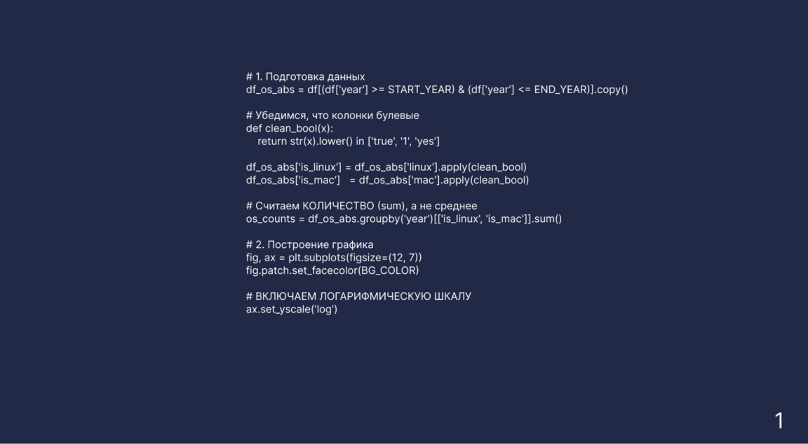 Чтобы проверить это, я построила график абсолютного количества игр (в штуках), выходящих на Mac и Linux каждый год. Потом использовала логарифмическую шкалу, чтобы увидеть динамику роста.