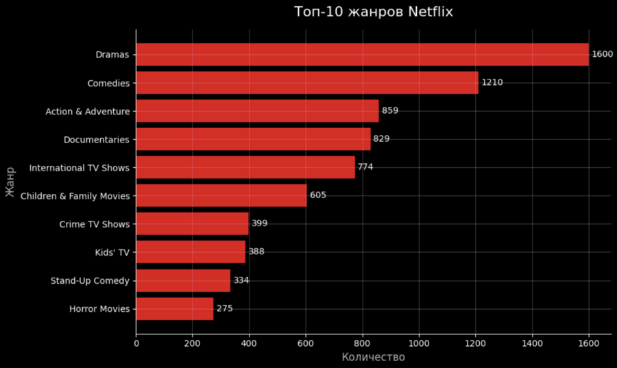 Когда я построила график самых популярных жанров, картина оказалась гораздо понятнее, чем ожидалось. На первом месте — драмы, и это логично: именно к историям о людях, их конфликтах и переживаниях зрители возвращаются чаще всего. На втором месте — комедии, которые дают ту лёгкость, которой иногда не хватает после рабочего дня. Далее идут более динамичные жанры — экшен и приключения, а затем — документальные фильмы, которые в последние годы стали сильной стороной Netflix.