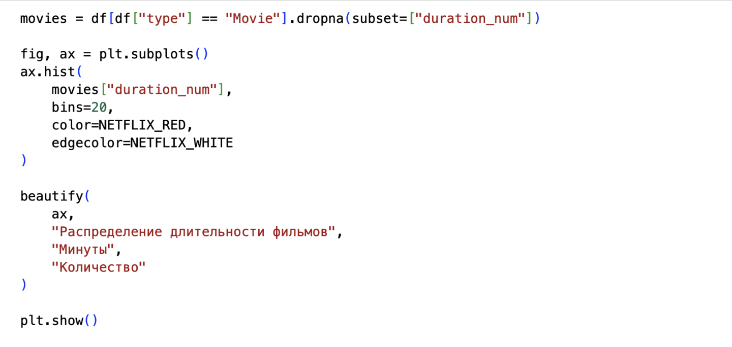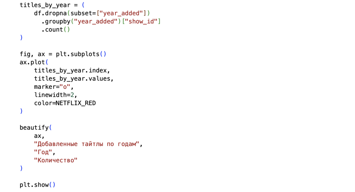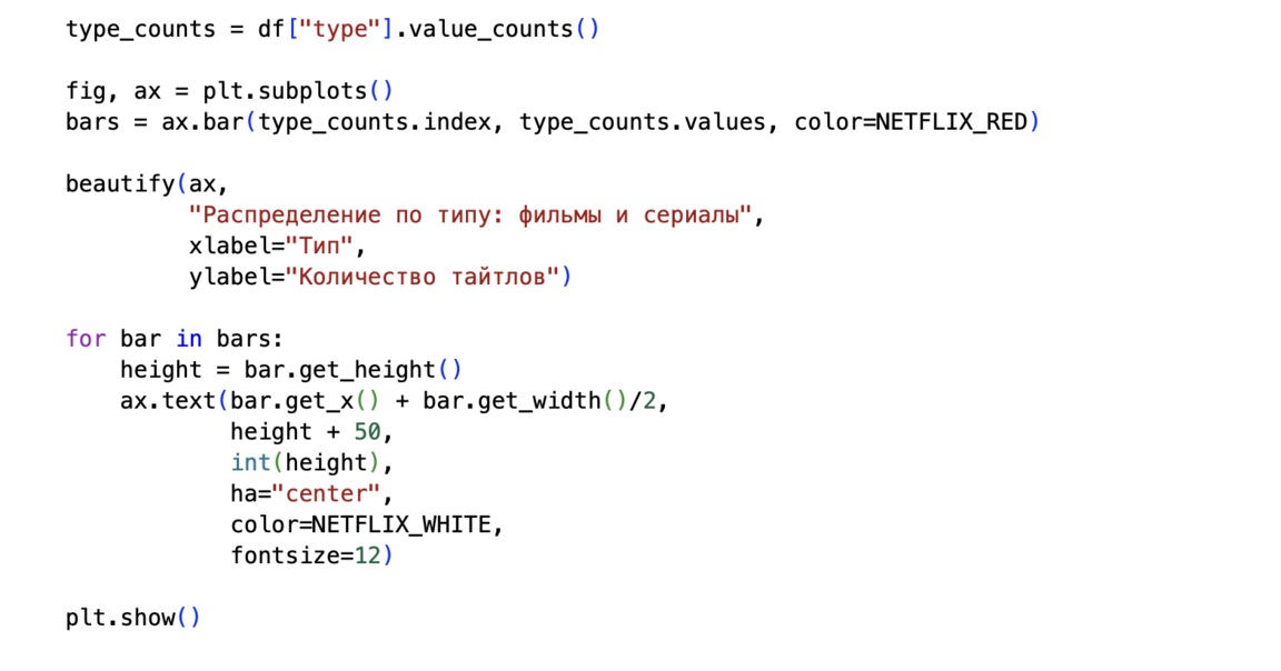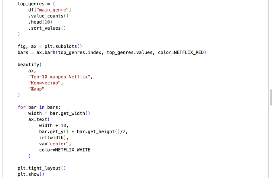 — Python и его библиотеки pandas — основа работы с таблицей; matplotlib — создание графиков и стилизация под эстетику Netflix; numpy — вспомогательные вычисления.