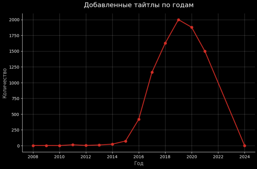 После 2020 года число добавлений уменьшается. И это тоже говорит о многом — возможно о переосмыслении стратегии, о смене акцентов или просто о насыщении огромного каталога, который больше нельзя раздувать бесконечно.