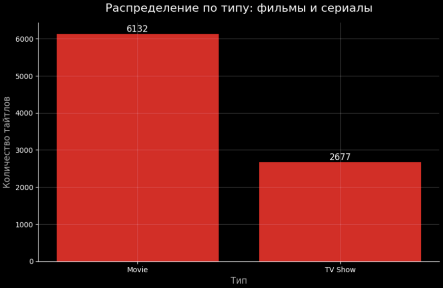 Я решила проанализировать один из самых полных открытых датасетов Netflix с платформы Kaggle, чтобы разобрать на части то, что мы обычно воспринимаем как единый поток контента. Мне было интересно понять, какие жанры формируют лицо Netflix, как менялась интенсивность добавления тайтлов по годам, чем отличаются фильмы от сериалов и какое место в этом мире занимают документалистика, драмы или комедии.