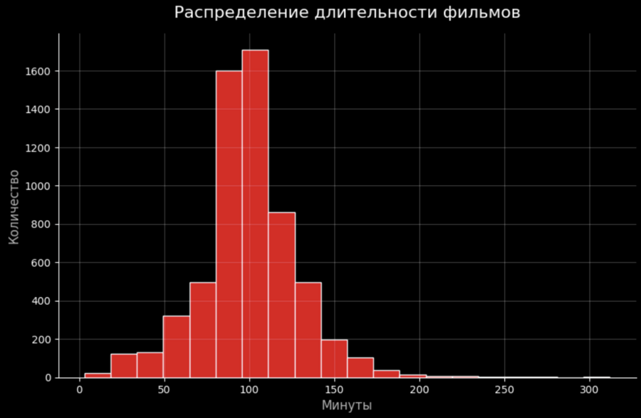Гистограмма длительностей показывает очень чёткую тенденцию: большинство фильмов на Netflix идут около 90–100 минут. Это стандартная продолжительность полнометражного кино, и она кажется удобной и привычной. Такие фильмы легко смотреть одним вечером — не слишком коротко, но и не утомительно.