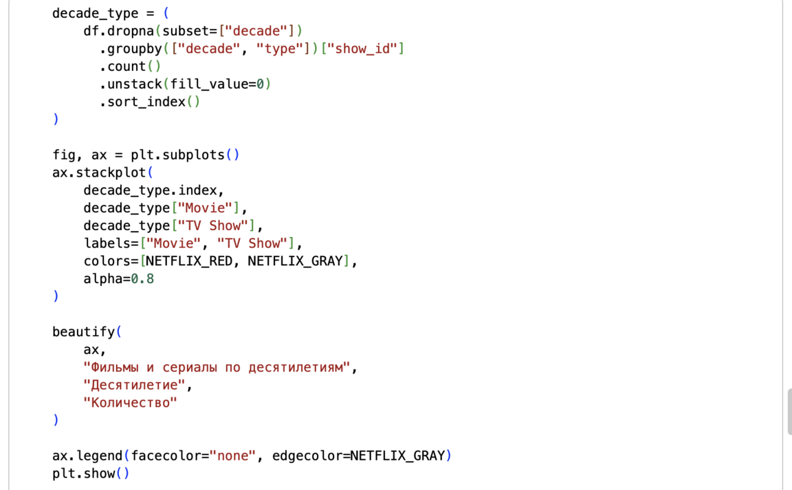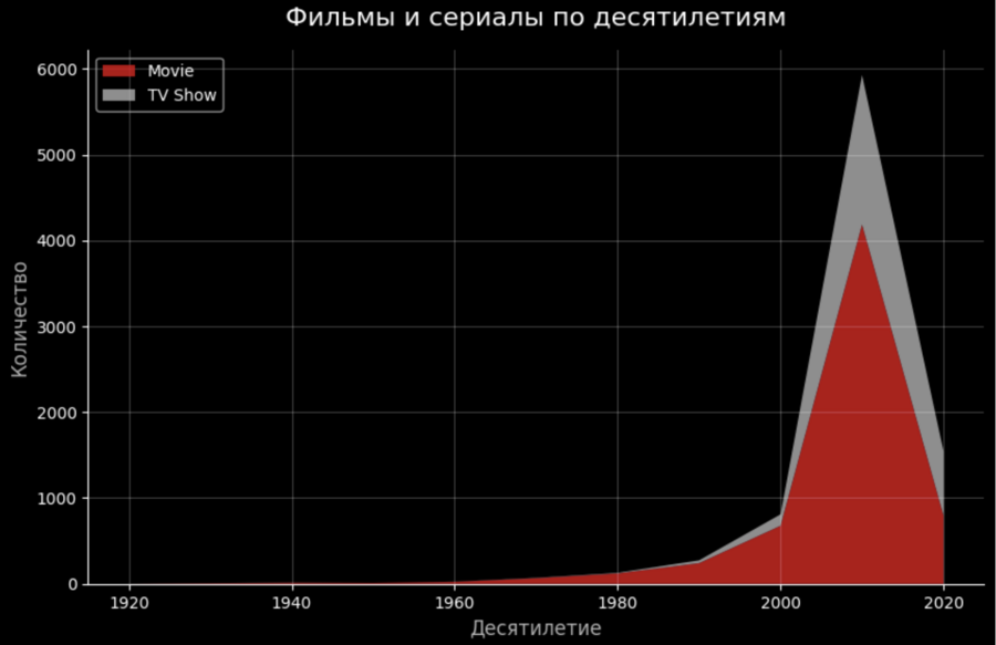 Сложенный график по десятилетиям показывает, что основная часть каталога Netflix относится к новейшему времени — начиная с 1980-х и особенно к 2000–2010-м годам. Старых фильмов и сериалов в каталоге почти нет, и это хорошо отражает стратегию платформы: она делает ставку на современный контент.