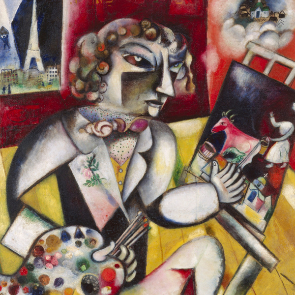 Далее перейдем и к непосредственно самому автопортрету на картине. Творец — частый символ на картинах Шагала, и, зачастую, это автопортрет самого художника. Каждый из них — насыщенный и уникальный, вместе они являют собой все разнообразие стилей, к которым приходил Шагал за свой творческий путь — отражая не только его самого, но и время создания, внутренние интересы и стремления художника, обращаясь как к мировой живописи, так и к национальному колориту. Художник — и творец реальности, и чуткий следователь ее законов.