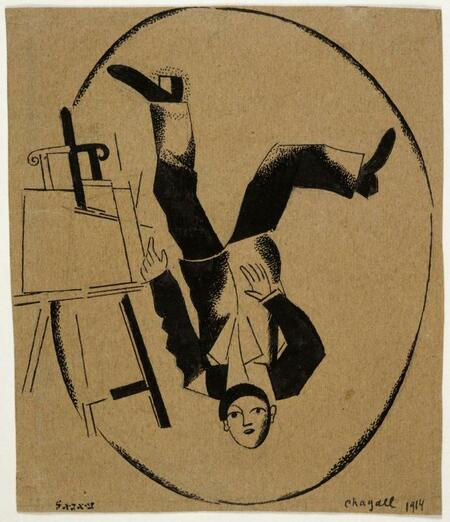 Однако образ в «Вокруг Нее» — художник с перевернутой головой. Впервые такое изображение человека встречается у Шагала в картине «Поэт, или пол четвертого» 1912 года, а после — в рисунках 1914–1915 годов.