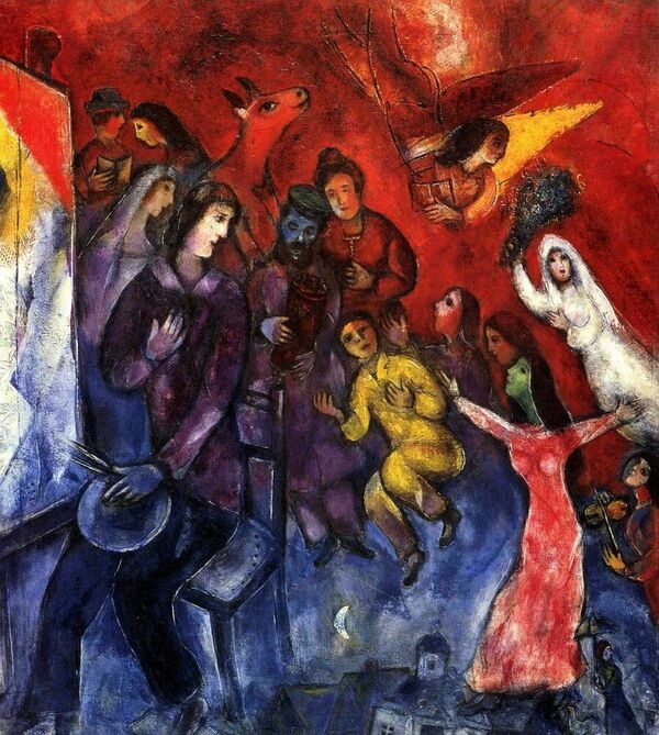 Как и с Беллой, творчество Шагала глубоко связано с образами влюбленных и молодоженов — на протяжении всего творческого пути у художника возникает тема соотношения мужского и женского начал и их соединения. И, рассматривая образ влюбленных, я, наконец, хочу обратиться к картине-сестре «Вокруг Нее» — «Свадебные Огни».
