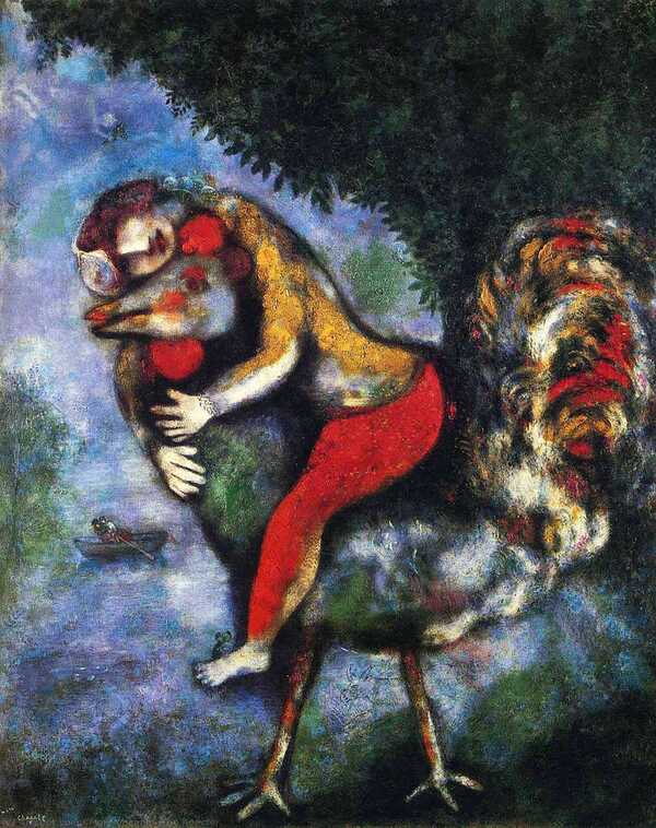 Животные в творчестве Шагала занимают совершенно особое место. В народной традиции звери несли сакральное значение. Так, петух, один из любимых персонажей художника, был не только символом огня и времени, но и главным действующим лицом религиозного ритуала искупления, проводившегося иудеями в канун Судного дня. На петуха перекладывали человеческие грехи и приносили его в жертву со словами «муж вместо мужа».