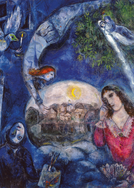В пространстве насыщенного синего цвета — цвета характерного для художника и любимого им, цвета первостепенного, линии горизонта нет: мир Шагала беспределен и бесконечно растекается во все стороны. Единственные теплые пятна — месяц в волшебной светящейся сфере с панорамой витебских домов, и освещаемые им розовое платье Беллы и огненные волосы акробата.