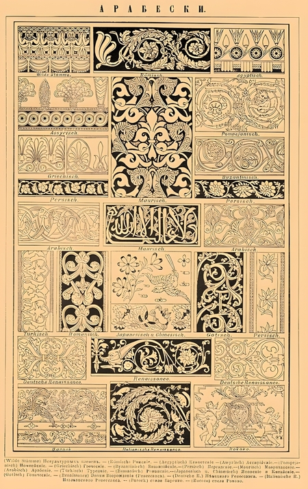 Растительный — классическая арабеска с вьющимися стеблями, лозой и цветами.