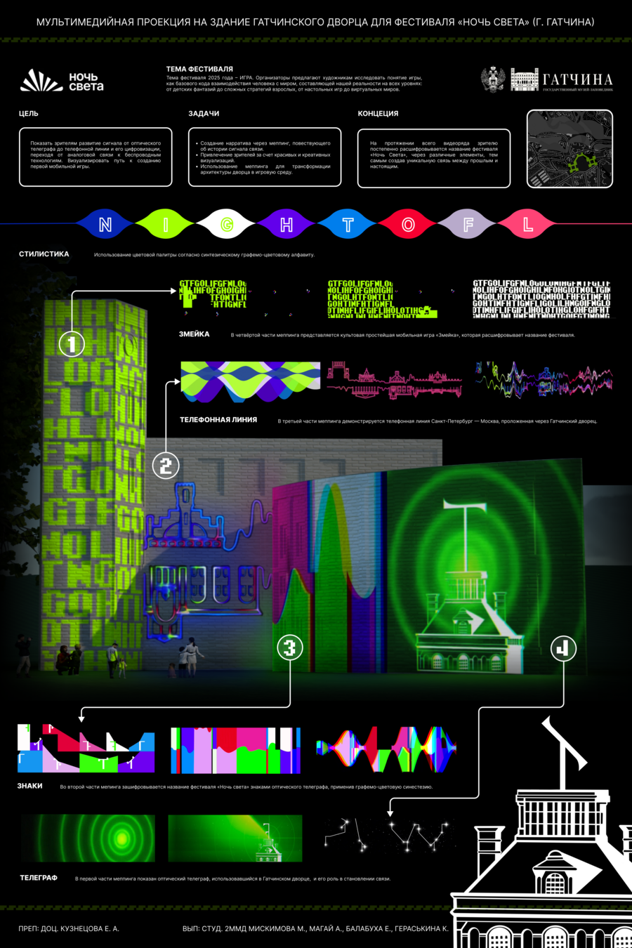 Тема фестиваля 2025 года — ИГРА. Организаторы предлагают художникам исследовать понятие игры, как базового кода взаимодействия человека с миром, составляющей нашей реальности на всех уровнях: от детских фантазий до сложных стратегий взрослых, от настольных игр до виртуальных миров. Цель проекта показать зрителям развитие сигнала от оптического телеграфа до телефонной линии и его цифровизации, переходя от аналоговой связи к беспроводным технологиям. Визуализировать путь к созданию первой мобильной игры. Концепция заключается в том, чтобы на протяжении всего видеоряда зрителю постепенно расшифровывается название фестиваля «Ночь Света», через различные элементы, тем самым создав уникальную связь между прошлым и настоящим. На протяжении всего видеоряда зрителю постепенно расшифровывается название фестиваля «Ночь Света», через различные элементы, тем самым создав уникальную связь между прошлым и настоящим.