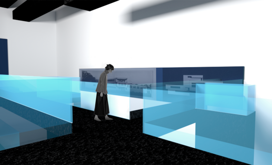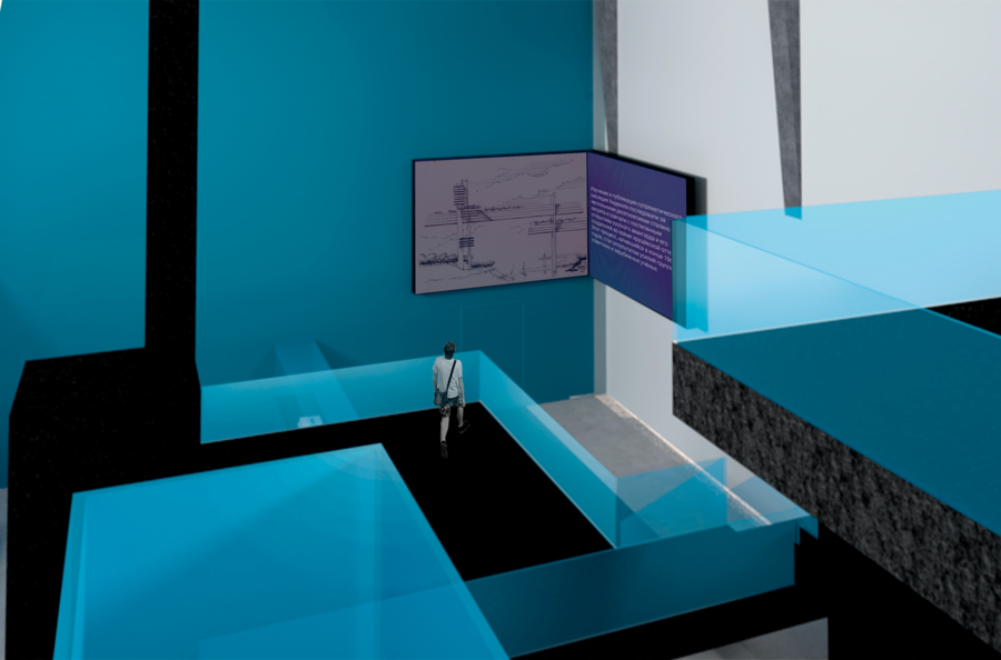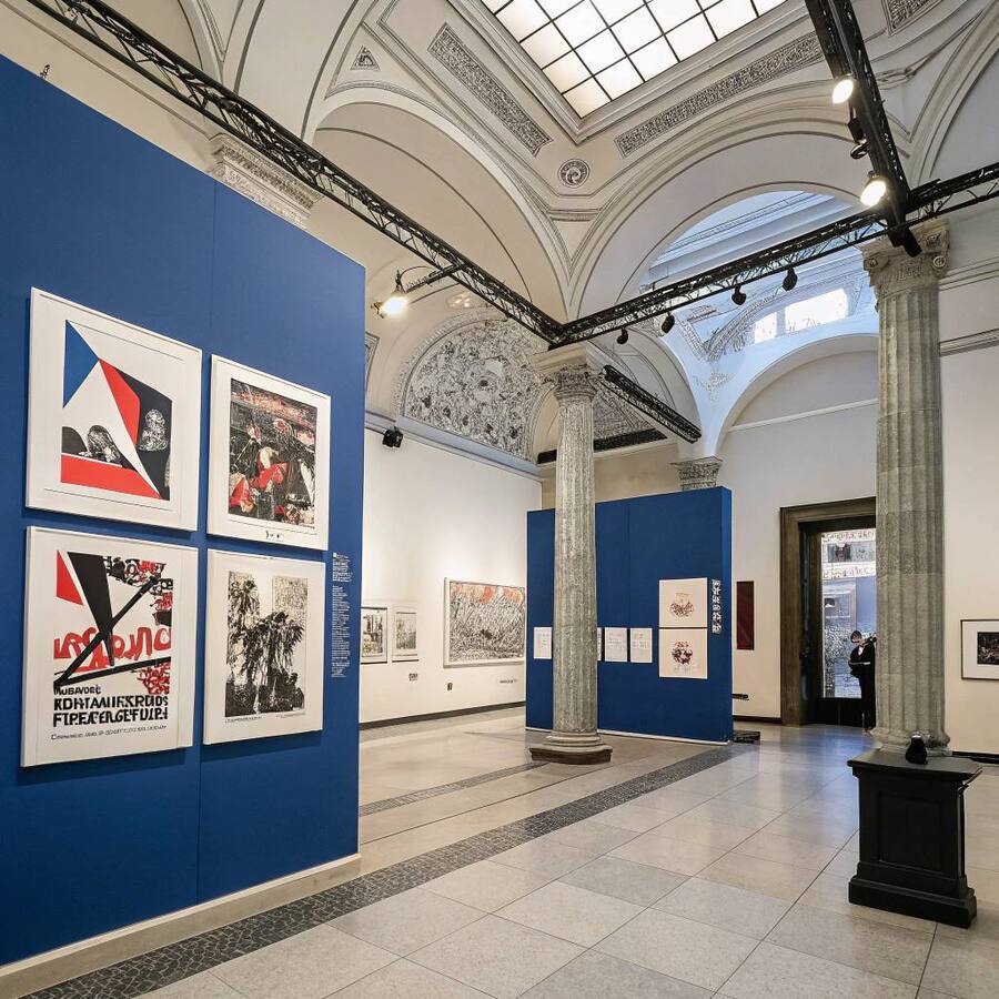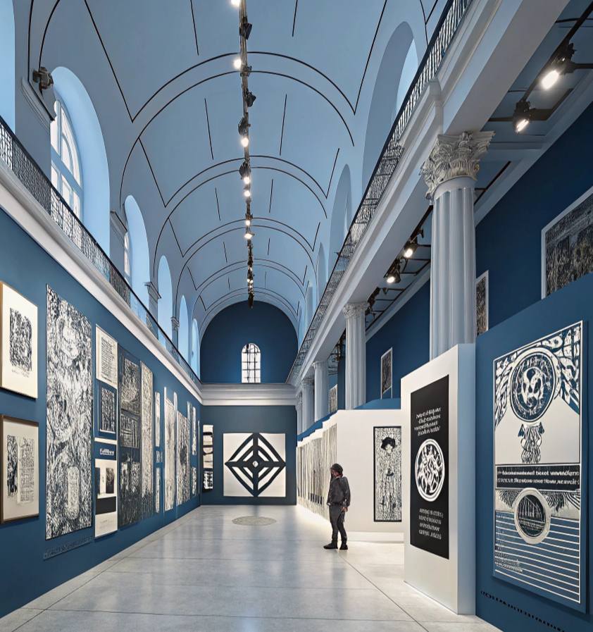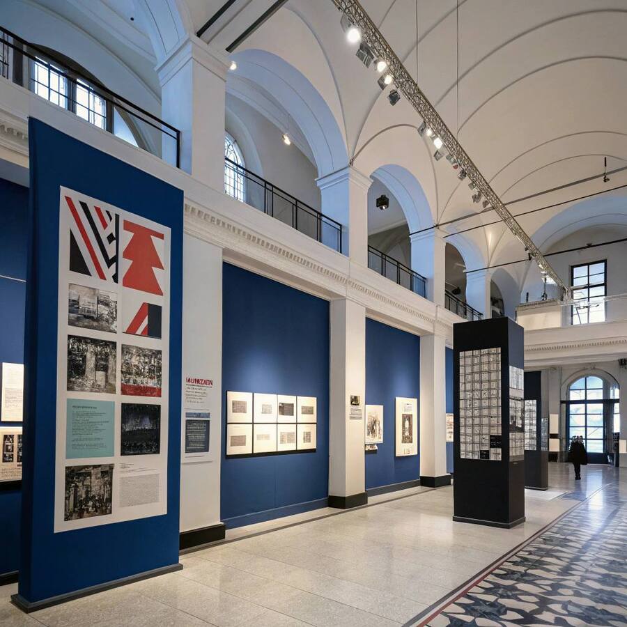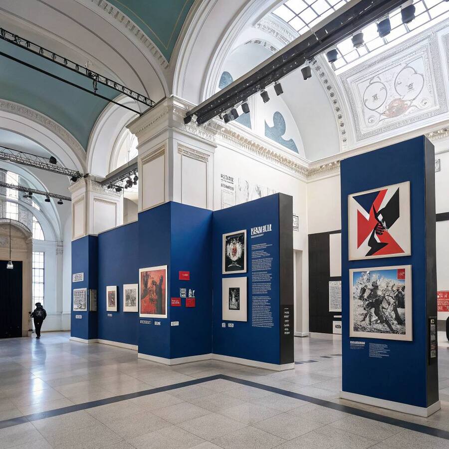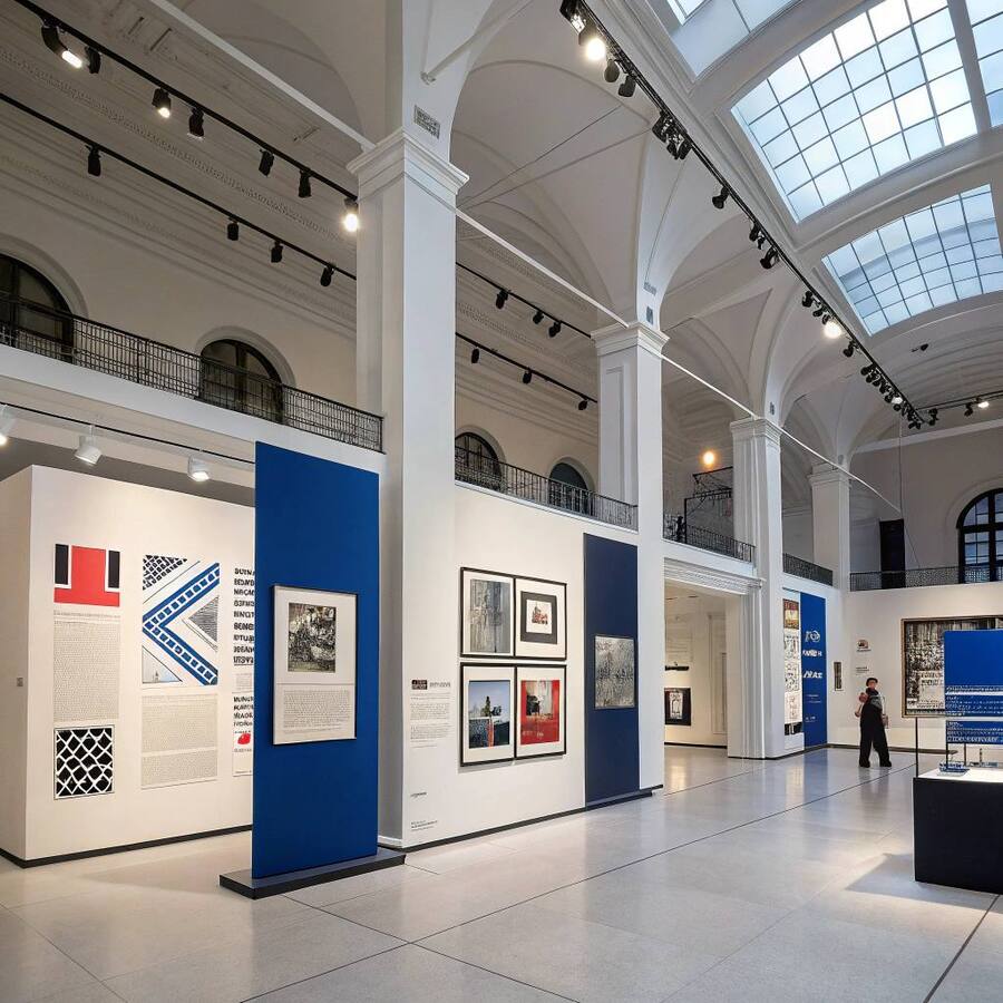 1. imagine prompt: the interior of the exhibition dedicated to supremacist artists. The space is decorated in blue, black and white. there are layouts and posters in the style of suprematism. a hall with high ceilings in a modern building