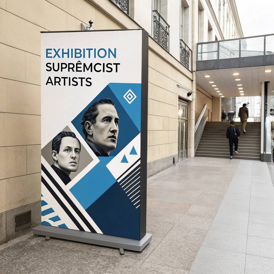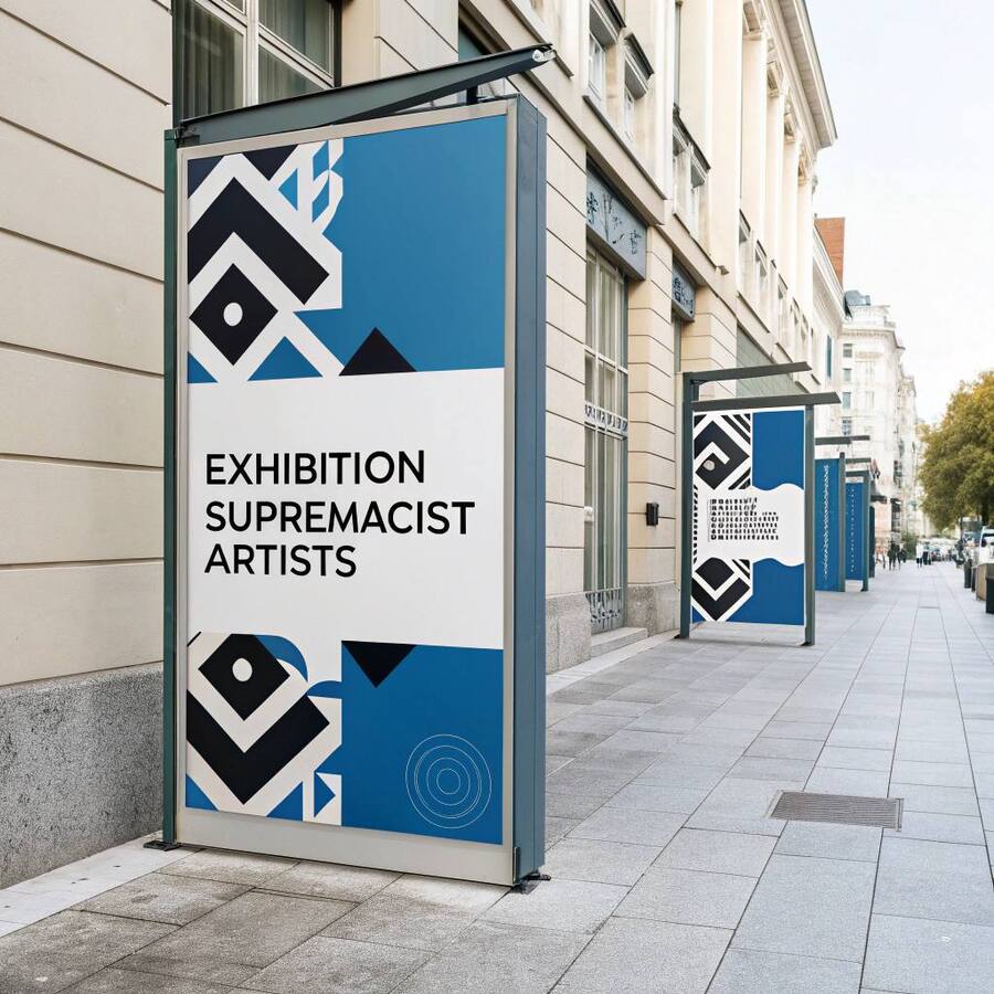 imagine prompt: create advertising posters for the exhibition of supremacist artists in blue, white and black