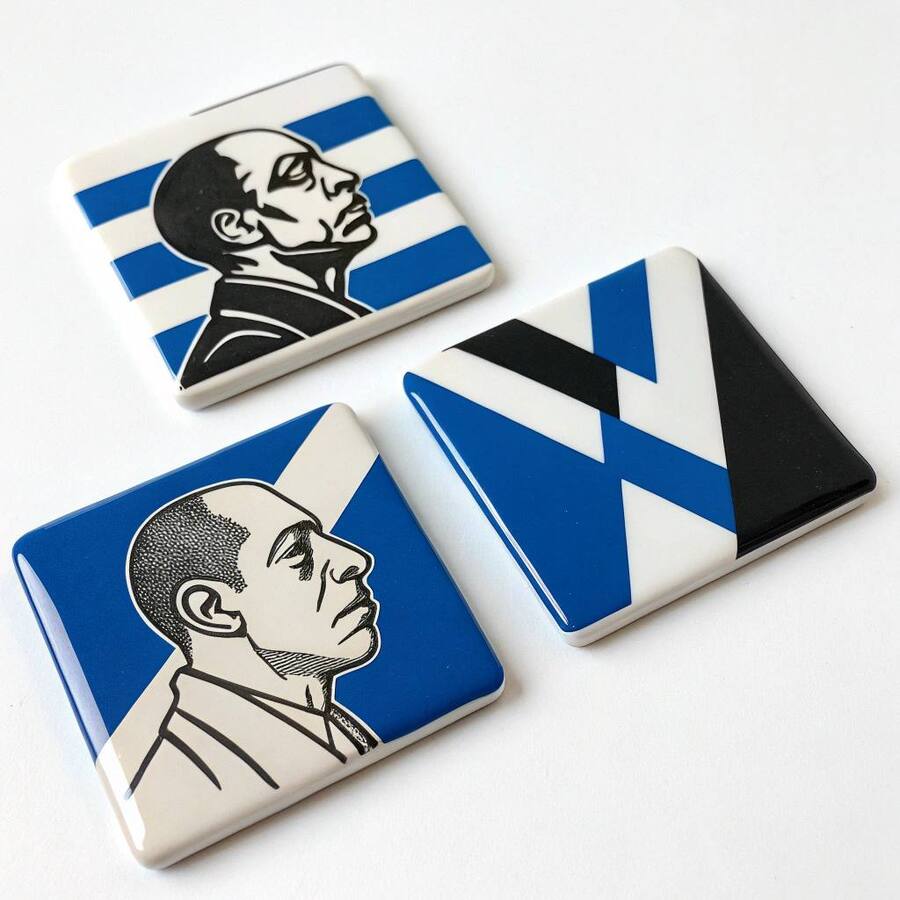 1. imagine prompt: create a badge and souvenirs for the exhibition of supremacist artists in blue, white and black