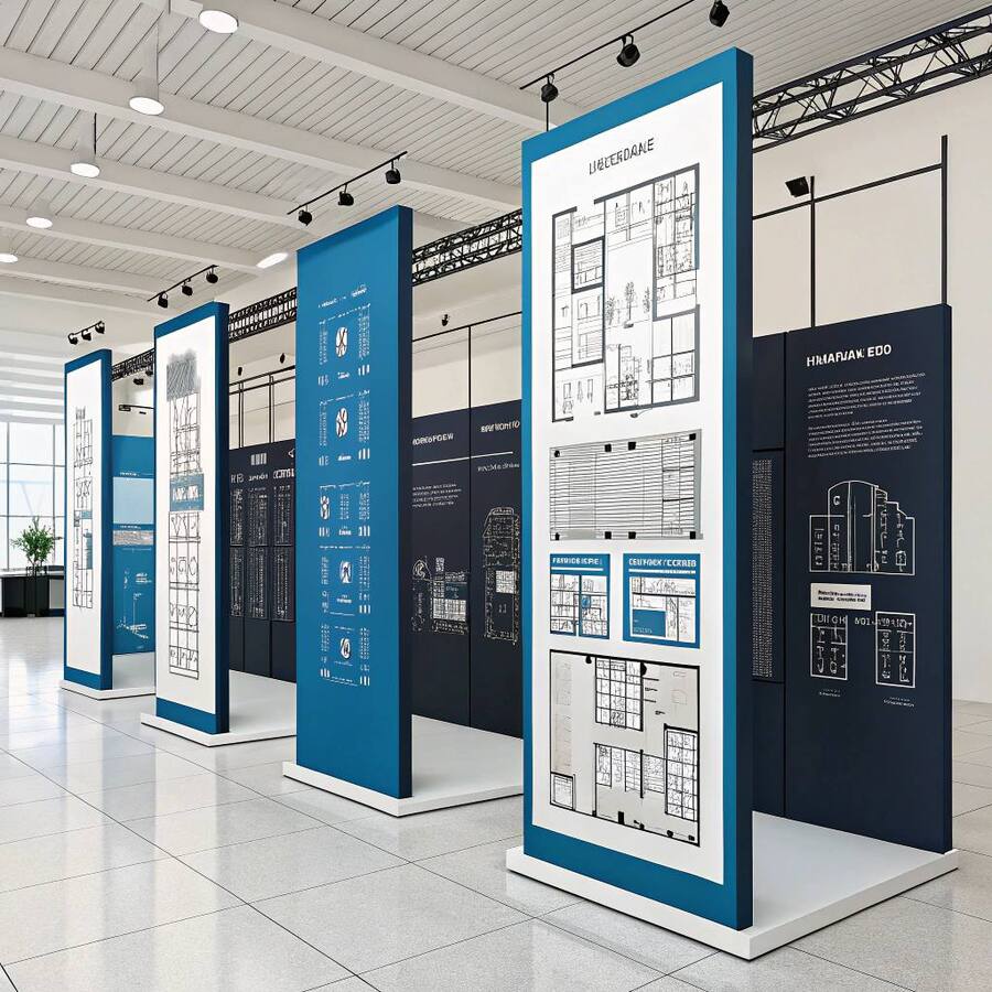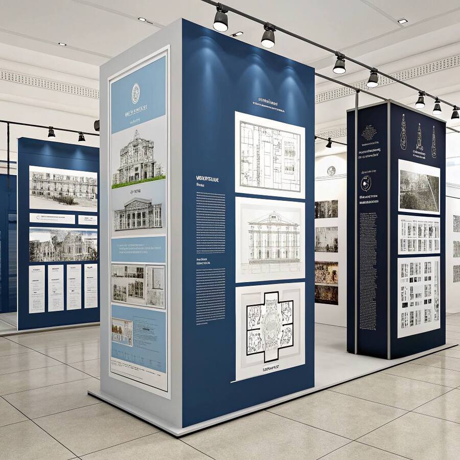 2. imagine prompt: create an exhibition with drawings and plans of building layouts in blue white and black