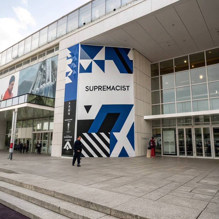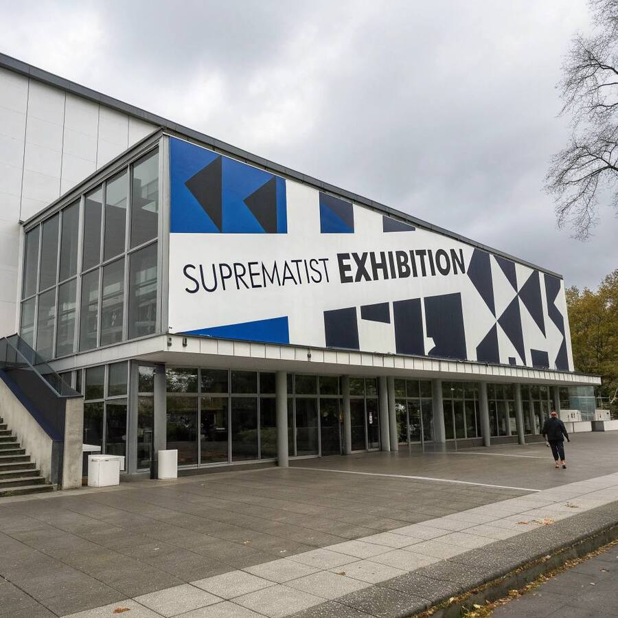 imagine prompt: generate the facade of the building where the avant-garde art exhibition is taking place. The building should have an advertisement for the supremacist exhibition in blue white and black