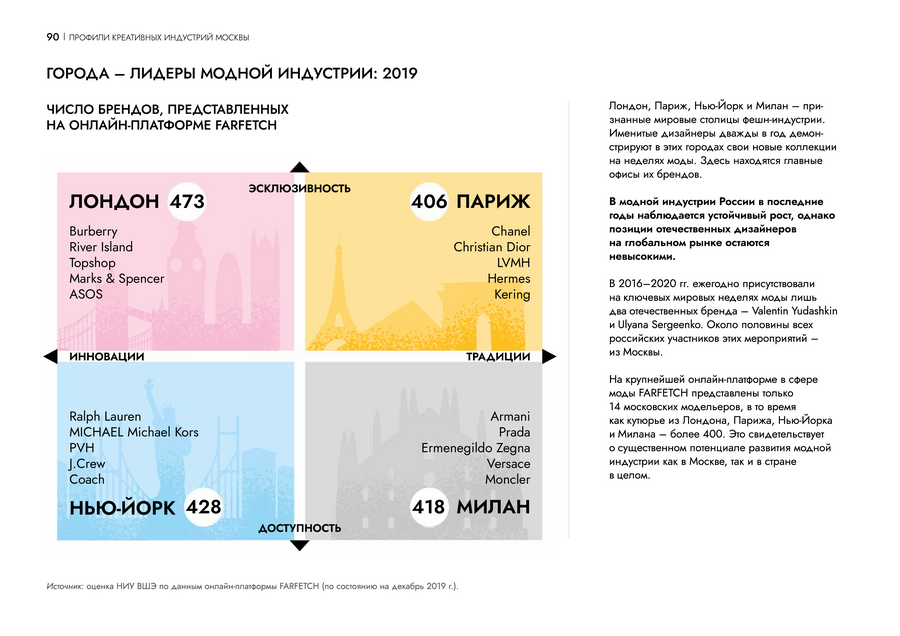 В докладе показаны результаты статистических измерений креативной экономики Москвы. Авторы издания представляют классификацию креативных индустрий Москвы, описывают подходы к расчету ключевых показателей экономического развития. Приводятся оригинальные оценки занятости в креативных профессиях и внешней торговли. Важная часть доклада инфографические профили отдельных креативных индустрий.