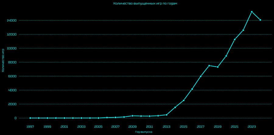 С помощью представленного графика стало очевидно, что Steam — действительно актуальная платформа, количество выпущенных игр с каждым годом только растет (стоит учитывать, что за 2024 датасет неполный и не включает игры, выпущенные после 15 сентября).
