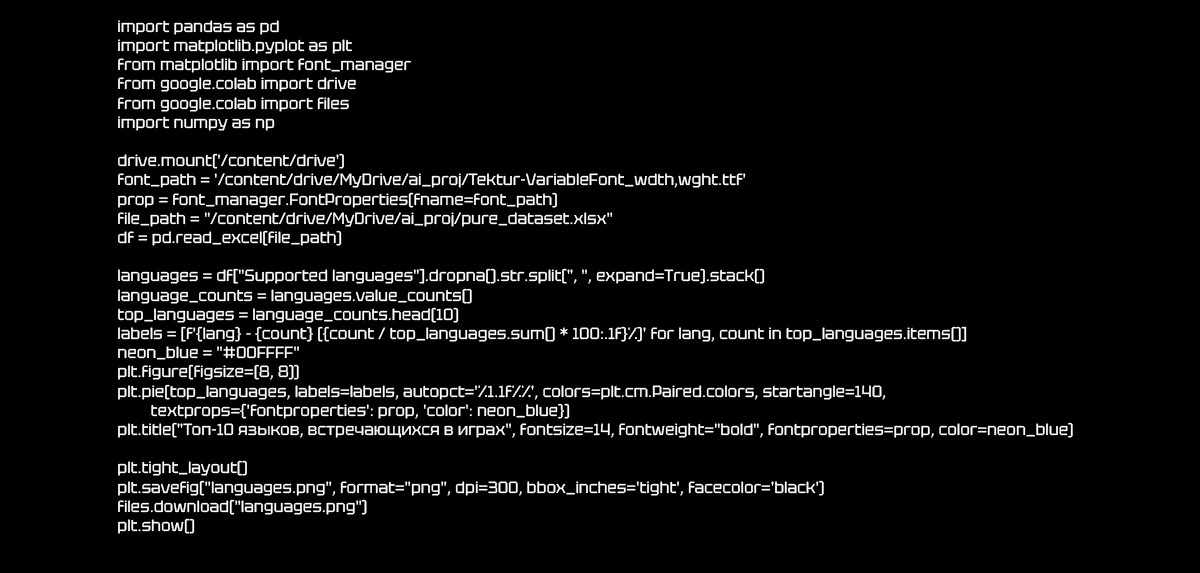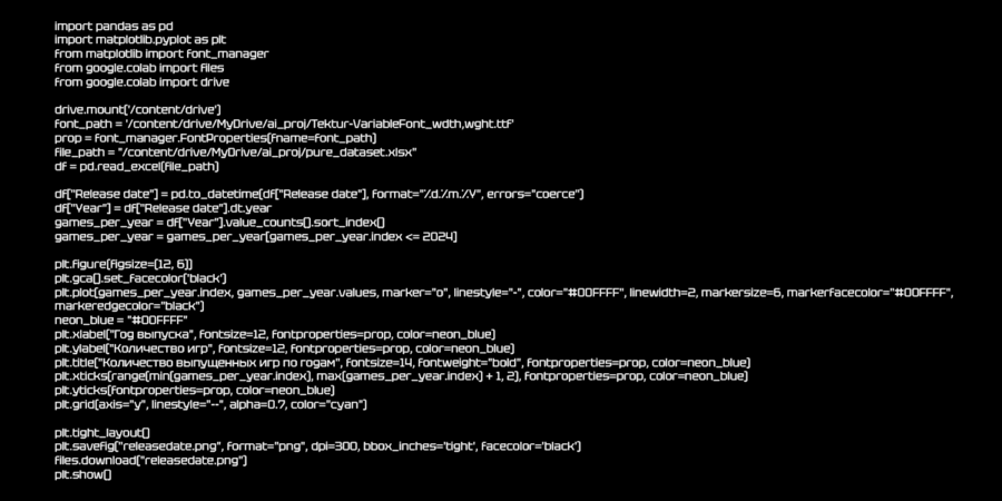 Я рассматривала несколько вариантов оформления — ретро-пиксели, игровые интерфейсы, но решила остановиться на футуристичном неоне. В качестве фоне для всех диаграмм я выбрала обычный черный, а затем подобрала яркие цвета для графиков.