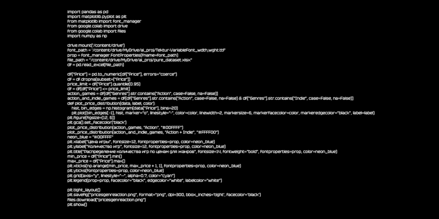 Далее я определилась с тем, какие библиотеки мне понадобятся — импортировала pandas, matplotlib.pyplot и numpy для анализа данных и построения графиков, а также google.colab для загрузки выбранного шрифта и датасета.