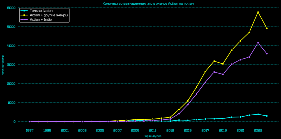 Сначала я составила график для игр с жанром только Action, но это оказалось малорепрезентативным — и я решила посмотреть игры, где Action встречается с любым другим жанром. Тут стало ясно, что моя игра не может быть чистым экшеном — спрос на такие игры небольшой.