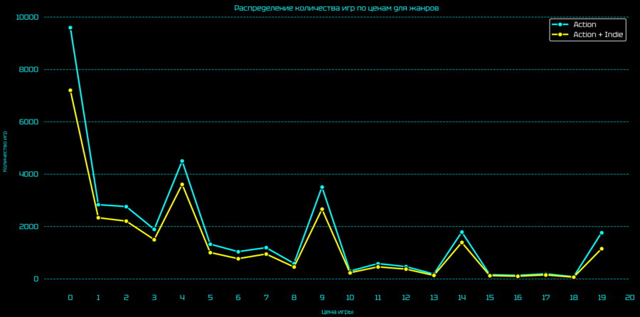 Четко определившись с жанром, я решила посмотреть, какую цену (в долларах) могу поставить. Для этого я взяла стоимости всех игр в жанре Action, а также выделила мой срез Action + Indie.
