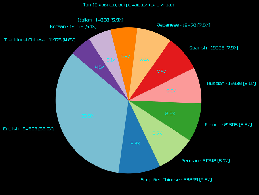 Затем я вывожу топ-10 языков в виде круговой диаграммы. К сожалению, подобрать красивые неоновые цвета под каждый язык не получилось, поэтому я использовала дефолтные варианты.