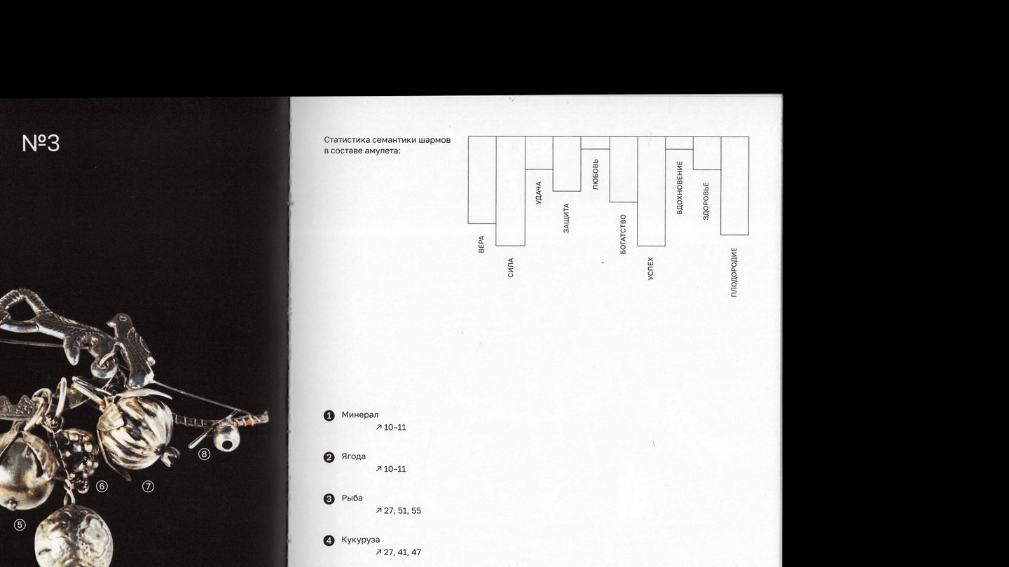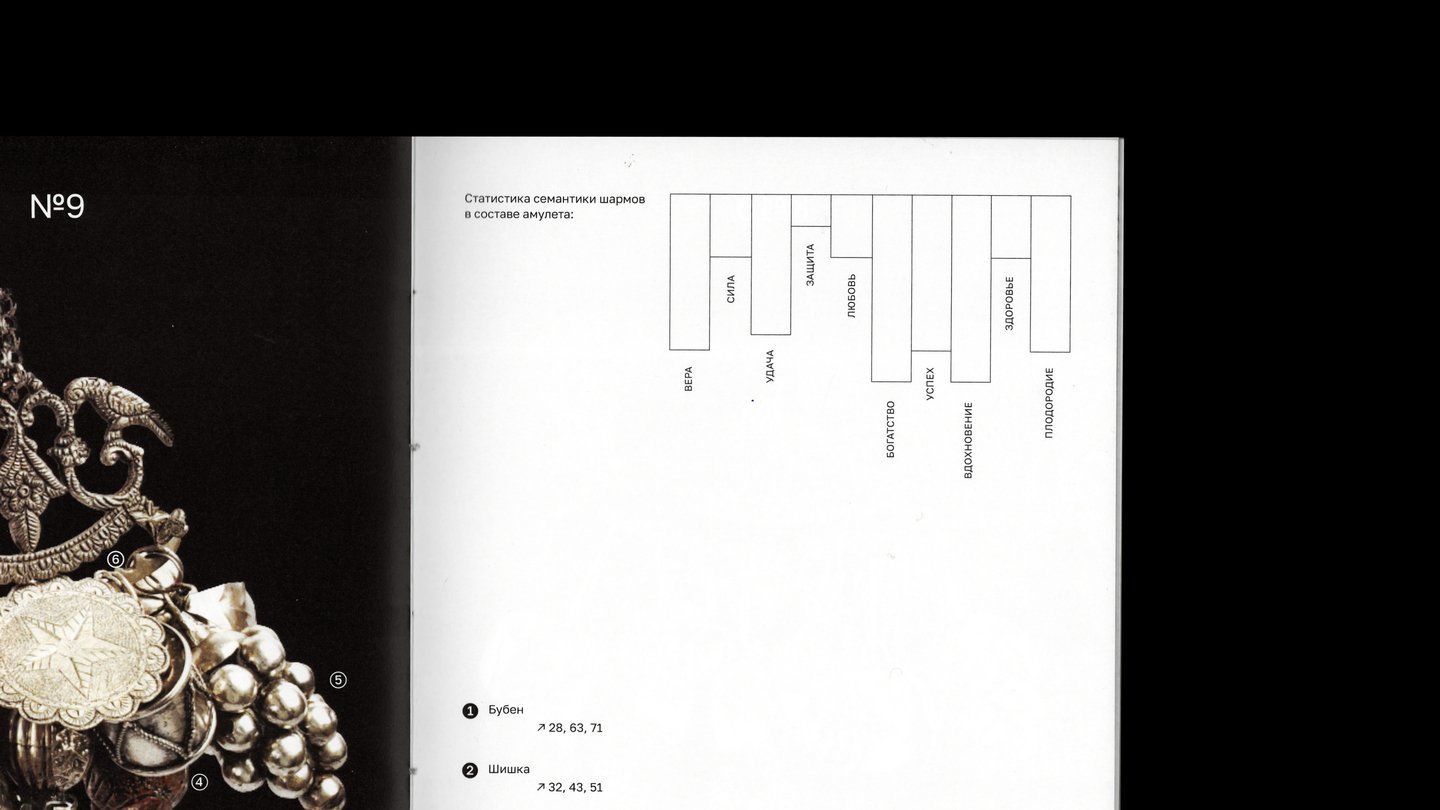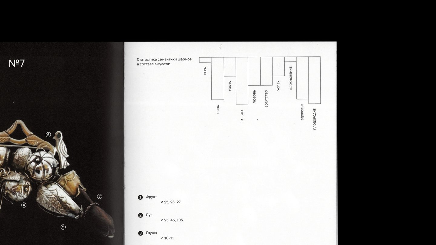 Глава, посвященная анализу амулетов, представляет собой развороты с украшением и статистикой: состав амулета, сквозная навигация к страницам с другим контекстом для каждого шарма, диаграмма-статистика смыслов балангандана и общий вывод после анализа.