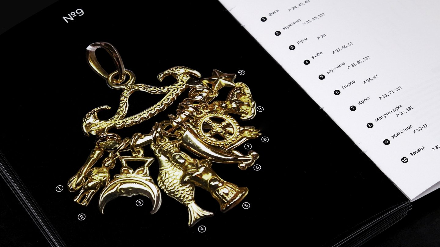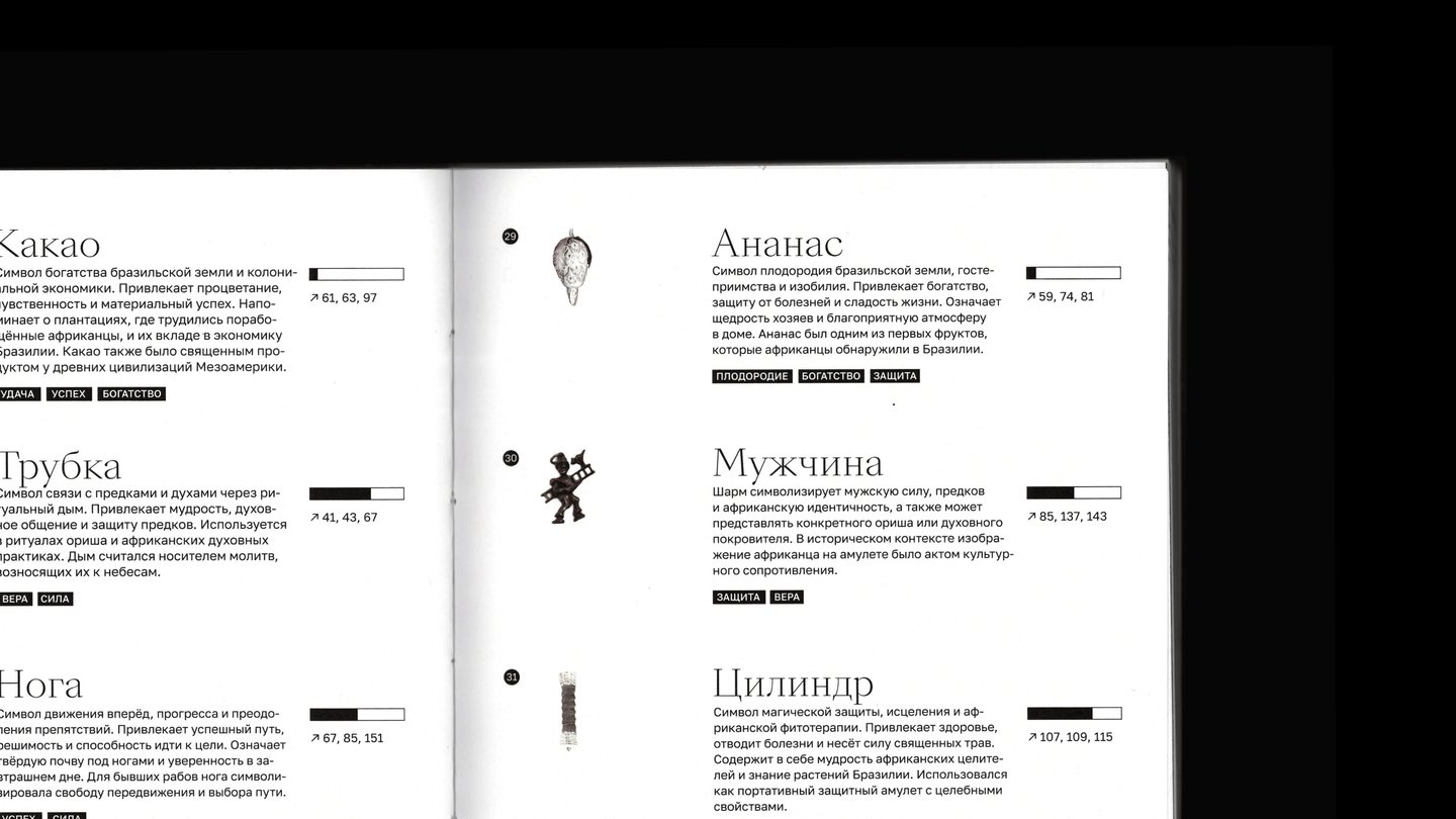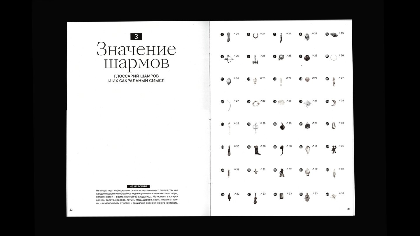 Глава, посвященная анализу амулетов, представляет собой развороты с украшением и статистикой: состав амулета, сквозная навигация к страницам с другим контекстом для каждого шарма, диаграмма-статистика смыслов балангандана и общий вывод после анализа.
