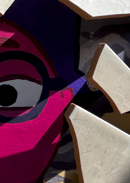 (3) ПЕРСОНАЖ, ЛОМАЮЩИЙ ЧЕТВЕРТУЮ СТЕНУ. ЧЕТВЕРТАЯ СТЕНА — ПОНИМАНИЕ ВЫМЫШЛЕННОГО ГЕРОЯ, ЧТО ОН НАХОДИТСЯ В НЕСУЩЕСТВУЮЩЕМ МИРЕ, И ЕГО ОБРАЩЕНИЕ К ЗРИТЕЛЯМ. РАЗБИТАЯ ПЛИТКА В РАБОТЕ — ТРЕСНУВШИЙ ЭКРАН, КОТОРЫЙ ПРОЛАМЫВАЕТ ПЕРСОНАЖ ОТ ОСОЗНАНИЯ СВОЕГО ЗАТОЧЕНИЯ И НЕВОЗМОЖНОСТИ ВЫХОДА ИЗ МУЛЬТФИЛЬМА.