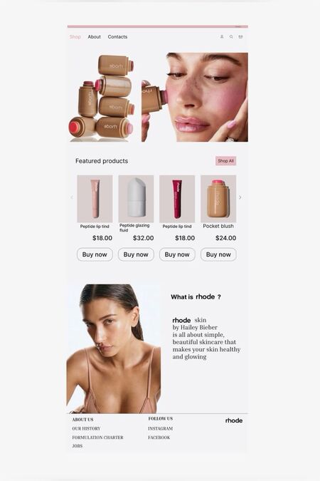 На странице «About Us» Rhode определяет свою миссию как «making one of everything really good», подчёркивая, что их подход — это простота, многофункциональность и забота о коже. Эта миссия дублируется в визуальном ряде: от равномерно освещённых крупноплановых фотографий до отсутствия лишнего графического шума. Rhode говорит с потребителем визуально так же, как в тексте — спокойно, уверенно, честно.
