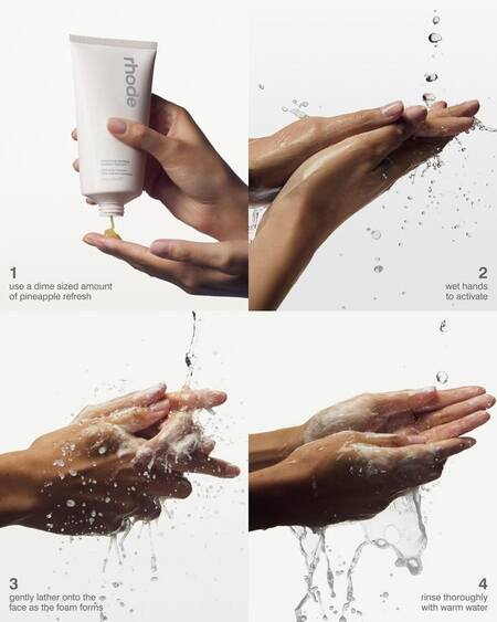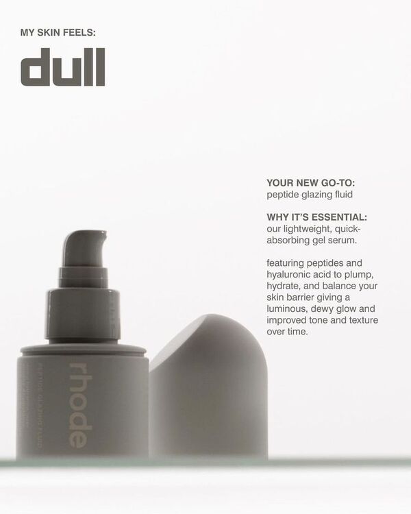 Формулировки создают образ желаемого состояния (увлажнённая, сияющая кожа), не перегружая читателя. Это ключевая особенность визуального и текстового языка Rhode: лаконичность, наполненная смыслом.