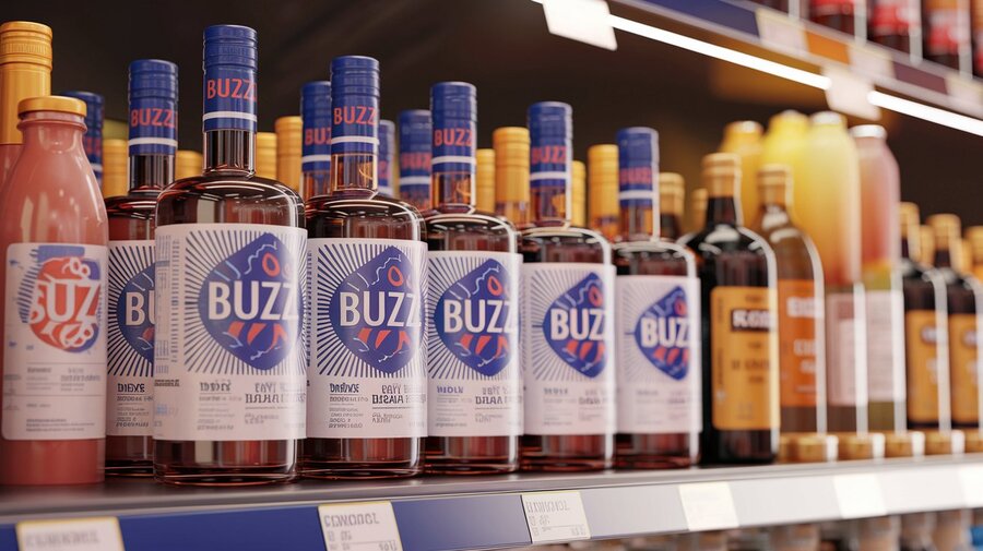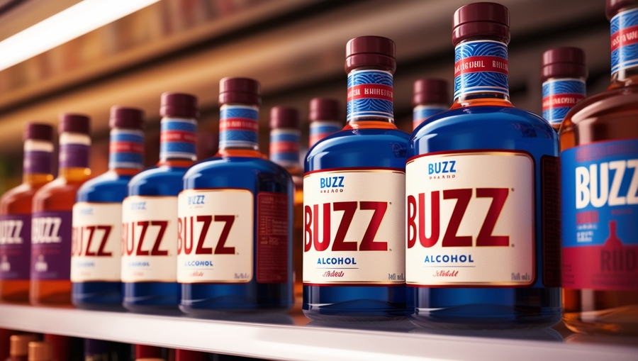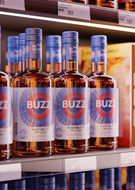 /imagine prompt: A 3D image of BUZZ brand alcohol bottles displayed on a supermarket shelf. The bottles have a design with blue — red labels. The bottles are located next to other products. The overall atmosphere of the image is warm and modern.