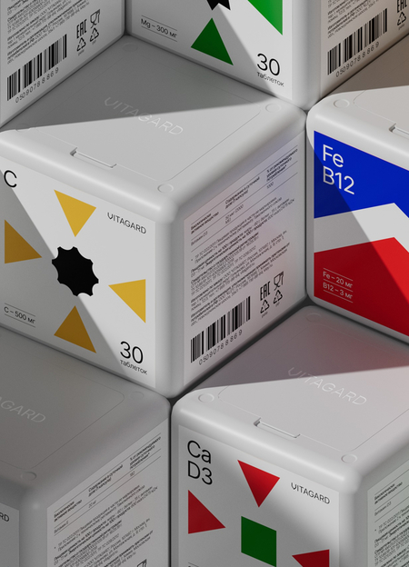 Графические знаки комплексных витаминов Vitagard формируются путём объединения символов отдельных компонентов. Это делает визуальную систему гибкой, модульной и легко считываемой: пользователь сразу понимает состав и назначение, а визуальная логика остаётся цельной и последовательной во всей линейке.