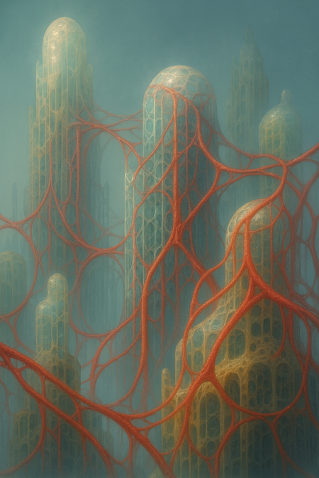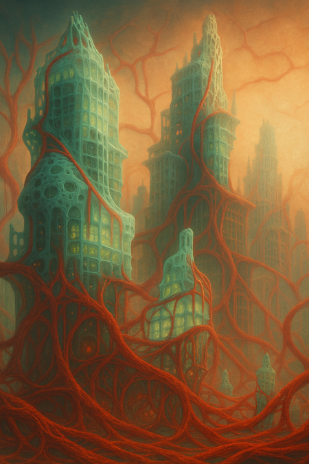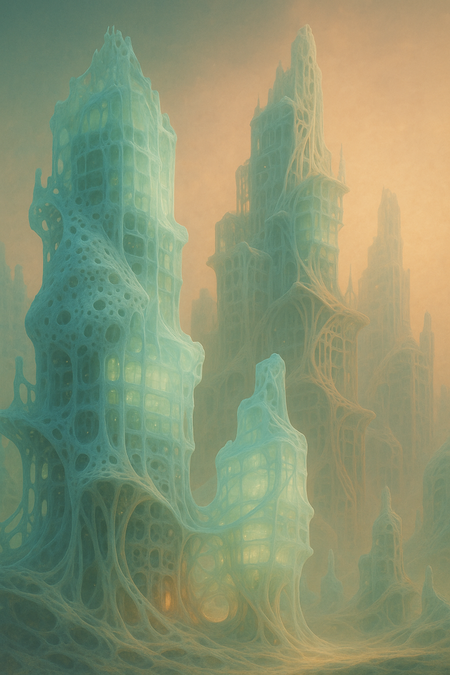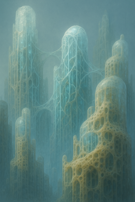 В колонии Лакуна дома не строят — их выращивают. Жилые столбы опираются на мицелиевые фермы, фасады «дышат», а инженерные сети — это микробные тракты, переносящие энергию и сигналы.