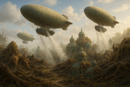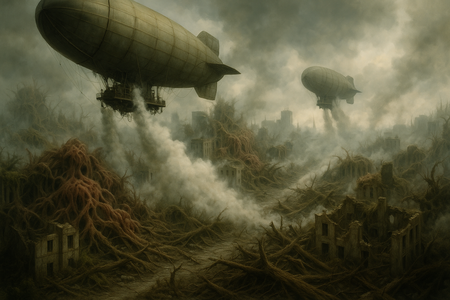 С дирижаблей распыляют тонкий аэрозоль, насыщенный ферментами‑деструкторами. Он «переваривает» разросшиеся биоткани, лишая их питания. Операция спасает город, но целые кварталы превращаются в гниющий бурелом. Заражённые леса образуют карантинные зоны.